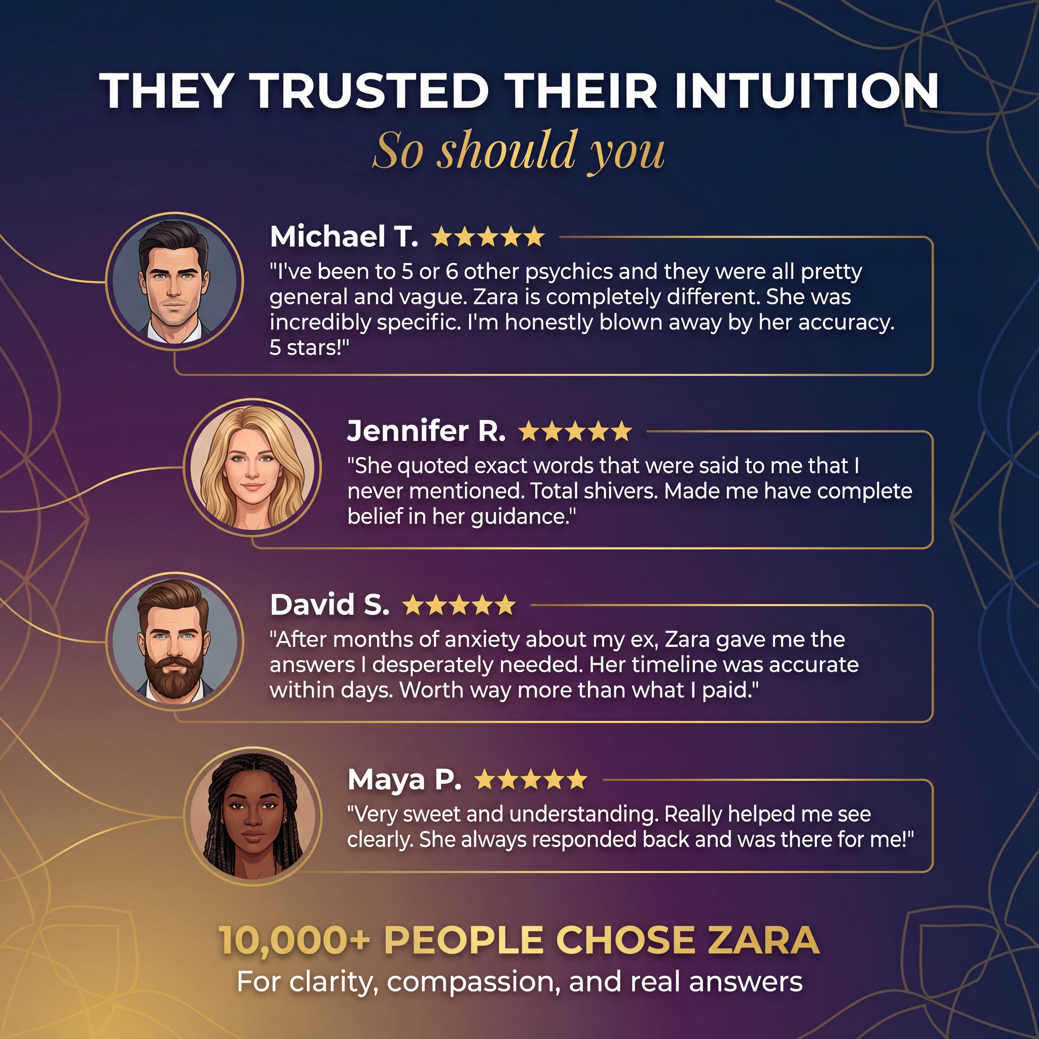 I've been to probably 5 or 6 other psychics over the years and they were all pretty general and vague. Zara is completely different. She was incredibly specific about my career situation and what would unfold over the next few months. Every single thing happened exactly as she described. I'm honestly blown away by her accuracy. Worth every penny.